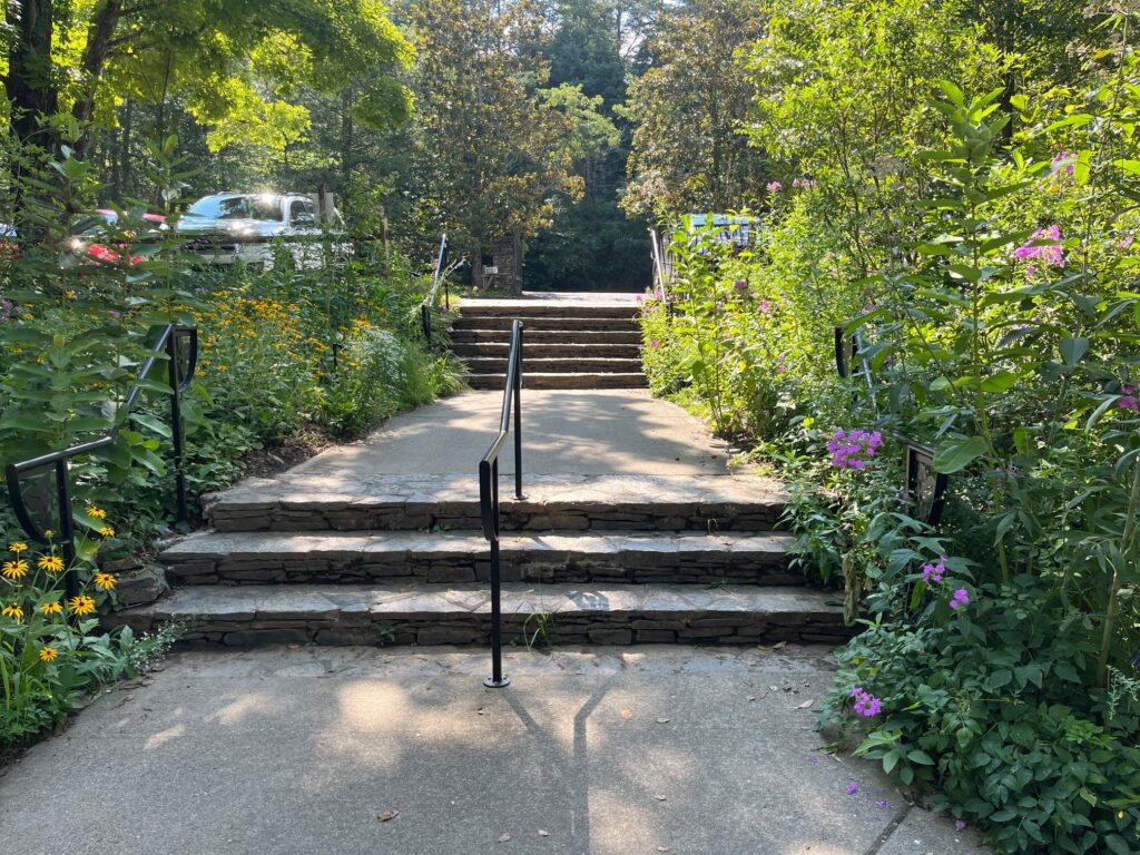 Located next to UNC Asheville, the Asheville Botanical Gardens offer a peaceful escape filled with native plants and seasonal blooms. Parking is convenient, with accessible spaces close to the entrance. A well-built ramp leads to the gift shop, where visitors can also access an accessible restroom. A concrete pathway circles to the other side of the building, and one observation deck provides an accessible spot to enjoy the gardens’ beauty without navigating rough terrain.